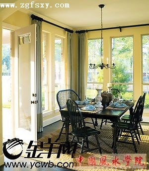 客厅或卧室的窗户过大或数量太多,容易导致内气外泄,家庭关系不和,如果发生这种情况,可悬挂百叶窗或窗帘来弥补这个缺陷,不过百叶窗比窗帘更易于吸纳外气,所以效果比窗帘好。窗户过小或四面不开窗的房间会显得寒伧小气,暗无天日,居住者也会变得气量狭窄,萎靡退缩。