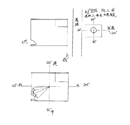 然后将屋定下中心点,把在街上量度了的度数分布在中心点上,这样屋内方位分布便定了,如大门入口,一般人说这是南方的门,但其实大门是屋中心的东南方辰山之内,又或者说主人房向西方,但主人房是在屋内之西北方便正确。