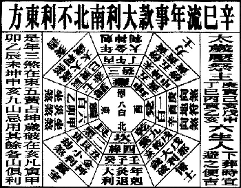 至于每年的年星会飞泊到那一个宫位﹝方位﹞,这个资料祗要翻查通胜便一目瞭然,例如2001年为辛已年,在图上中央八白,由干宫西北顺排九紫,坎宫北方四绿,艮宫东北二黑,震宫东方六白,巽宫东南七赤,离宫南方三碧,坤宫西南五黄,兑宫西方一白。