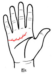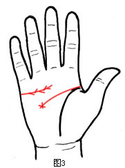 一般地说(如图3),在智慧线末端有叉状纹,表示这个人疑心较重,而感情线短促,且上下均有歧线支出,表示这个人在感情上最容易全部投入,同时也喜欢对方全部投入,而且把对方给予的爱当成是自己的“私有财产”,所以这种人的感情虽有可爱的一面,但更有可怕的一面,如果调整不当,就会容易引起无端风波。男女结合的媒介是爱情,爱情萌发需要土壤,这种土壤是彼此关心、体贴、呵护,而不是互相猜疑,所以有此手相的人切记:爱情不妨大撒把。