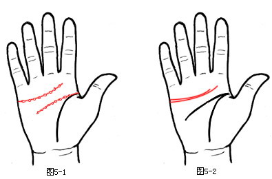 如果女人手上的感情线和智慧线均呈现锁链状态(如图5),或(如图5-2)手上有双重爱情线,那么这类女性一般喜欢与异性交往,并懂得争取自己的爱情,她们很独立也很主动,从不掩饰自己的真实感受。