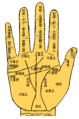 掌丘是在手掌上凸出或隆起的肉垫,称为丘或陵,因这些肉垫,很像小山,故命名为丘,而各丘按五行方位分为:木星丘、土星丘、太阳丘、水星丘、第一火星丘、第二火星丘、月丘、金星丘、地丘。在手相学上,虽有其自己专有的名称,但这些名称,都是从西洋占星学借来的,因它们有很多地方,和占星学的意义相同,同时因习惯和便利起见,所以采用这些术语。