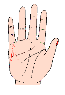 财运线断断续续(记号C)或曲曲折折的(记号B),表示金钱运较差,这时候受到生活困难的威胁或生意不顺当,内心至焦急不安,如有这般情形,应尽量忍耐,不必再予投资,力求消极以渡过难关。