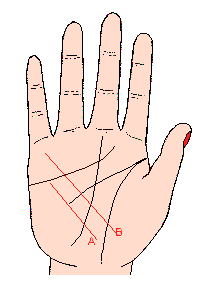 由土星丘(中指根部)至拇指分叉处刻划的弧形线条,与性生活关系至大(记号A),称之为(性爱线),在这个位置上的线,有时候仅止一条很明显,有时也会断断续续,更有的会生出岛形的记号,其形体很多;如果线条如同铁丝弯曲,而又明显,则表示患有性方面的疾病,请注意不要把它与命运线及灾难线混为一谈。