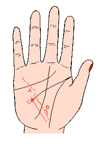 影响线下面生出小小横线而停下来(记号A),表示将与爱人突然分离,这类意外的变化,可能因突然发生事故或因第三者的情绪与反感,就此宣告仳离,岁数可参考生命线的流年法;影响线下端有十字形或星形记号(记号B)叫做(死的十字、死的星),主将遭爱人的死别或遭致命的大伤害。