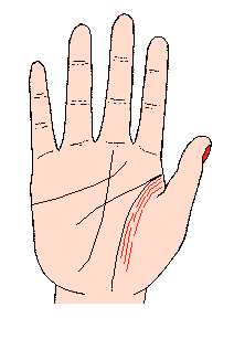 火星线是生命线内侧的线,较长的火星线,甚至由生命线起点伸出一直走到手腕子附近;火星线可以说成(活力线),当精力充满时,表示斗争力之气势;这条线如果明显,纵然生命线较短或成为链子状,也足够补救其缺点,为衰弱的身体添上活力,为萎颓的精神增强气力,所以又称(第二生命线);无论男人或女人,这条线明显的人,对工作有热忱,更有耐心与勇气克服困难,而渡过快乐人生。不过此线亦有另一名称叫(痴情线),主对事物有一往情深的倾各,或长期痴恋某人,例怀念旧爱人(特别初恋情人)或崇拜、单恋心中偶像,使心境经常挂念着,特别容易恋上已婚之异性。少女则有恋父倾向。
