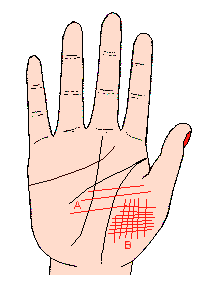 金星丘内的横线(烦恼线),与丘内的纵纹相交成为(纵欲格子)(记号B),表示因过份纵情色欲,而使健康衰退。如金星丘高耸、宽阔、富有弹力还好,否则如果金星丘低、缺乏弹力、颜色苍白则主体弱,甚至会患性无能、或性冷感等症。