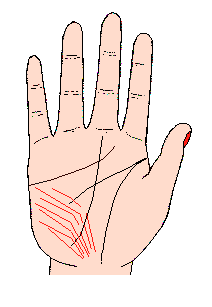 从地丘上面起,与月丘刻成拋物线的片断线条,达十几支,(通常在瘦弱的妇女常有此相),这表示性格很是神经质又很脆弱,时常顾虑周围人仕,容易使自己操心;有此相的人,在性爱方面欠缺活力,是从事夜晚职业的公关人仕,因过惯不规则生活,容易损害身体的人常见的手相。
