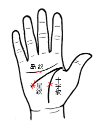 2、 星纹:在手掌上由三条或三条以上“短短的纹路”交叉而成,吉凶意义也是根据出现在手掌上的部位而各有不同。
