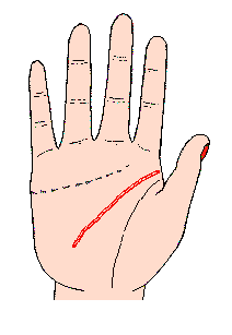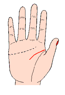 智慧线很短,只伸到无名指和中指之间或其附近,如此短的智慧线,又无劲,散漫向下垂的人,主头脑不灵活,处事轻率马虎,容易冲动,喜欢自吹自擂,抬高自己,粗鲁无礼,即使到了中年,仍然无法养活自己,必须依附别人的财产或恩惠来生活,或有生活不检点的倾向,此相通常都出现在流氓手中。