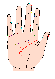 头脑线上有一个岛纹(记号A),表示易患头痛病,思想不平衡,终日浑浑噩噩,特别在爱情破裂之后,容易有自杀的念头;如岛纹近线之末端(记号B)主神经极微妙,稍受感情的刺激,神经就不正常,易犯神经衰弱症的人。如果头脑线上有齐两个记号,头脑线又幼弱无力、散乱,主想象力丰富,对生活缺乏适应能力,常有暗恋别人,及自恋倾向,如稍有不如意的事,就会发神经。