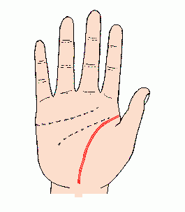 生命线形成大曲线,越过手掌中央的直线,即金星丘之面积显著的变大;金星丘表示精力及活动力和性能力,所以拇指球愈膨大,精力愈旺盛,不会感到疲劳,很容易的能够摆脱生活上的辛苦;但此精力如错用于性欲,则将会引起色情纠纷;主妇如有此种手相,除非丈夫精力很充沛,否则难免红杏出墙;年轻的女性有此相,即不易控制性欲,可能引起异性间爱欲问题。