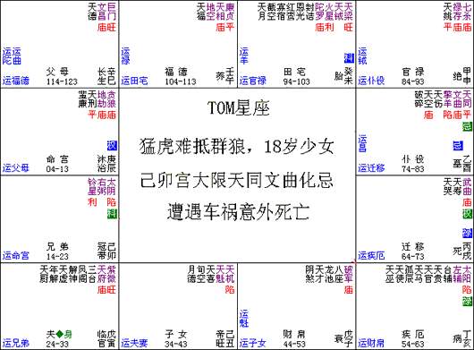 以上命格,第二大限己卯宫非常凶恶,对宫天同化忌冲。大限宫天干己文曲化忌又冲,双忌冲忌照加擎羊、三方煞星又重,所谓猛虎难抵群狼。迁移宫大凶,外出易发生事故。
