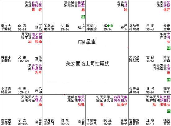 她当时22岁(2004年),大限在戊午宫,本宫星系组合可称良好,因此到外企工作,而且还算顺心。但流年太阳化忌与大限天机化忌夹大限宫位,来自外面的压力顿使她坐立不安。是什么原因呢?再看大限迁移宫,廉相外加咸池对冲流羊,因此得出一个结论:上司对她进行性骚扰。这点论断使她称奇不已,因为事实上日本老板想让她做情妇,她不愿意,上司经常在工作中骚扰她,她正为此烦恼不已。